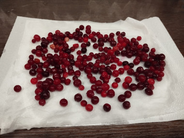 Промытые ягоды клюквы откиньте на дуршлаг и оставьте, чтобы с них стекла вода. Затем ягоды обсушите бумажными полотенцами, чтобы убрать с ягод лишнюю влагу.
