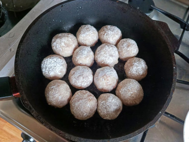 В другой сковороде разогрейте растительное масло для жарки. Обваляйте тефтели в муке и выложите в сковороду.