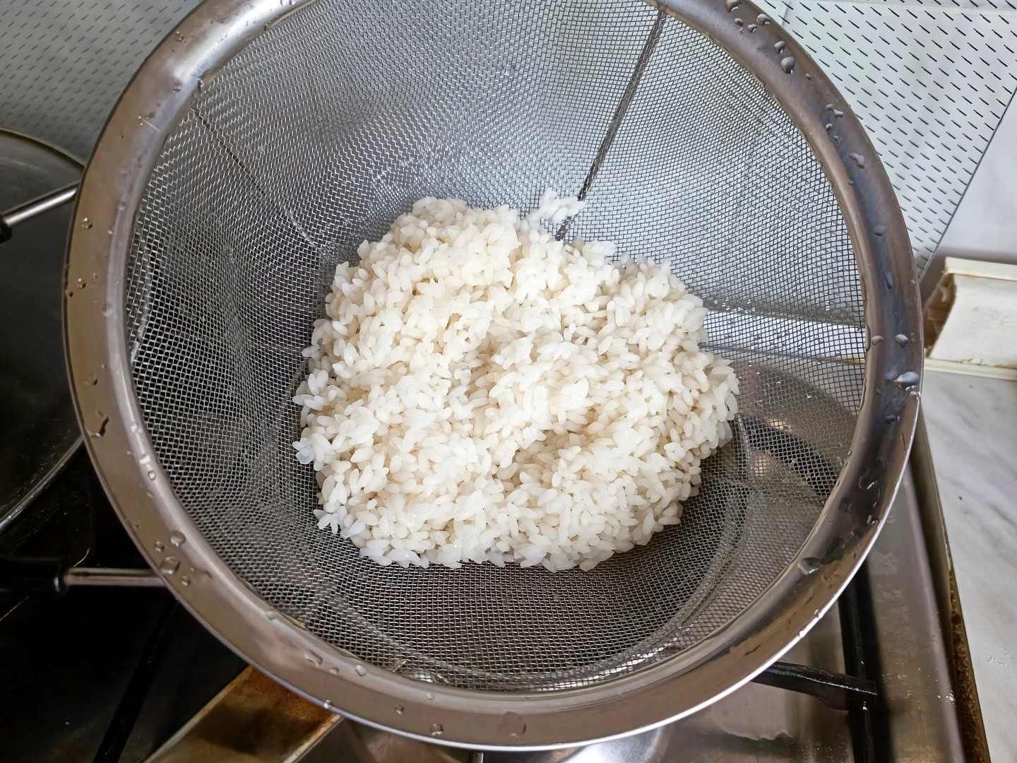 Первым делом подготовьте рис. Промойте крупу в нескольких водах, затем залейте чистой холодной водой и поставьте на огонь. Как только вода закипит, снимите сотейник с огня и слейте рис в сито. Промывать его не нужно. Оставьте рис остывать.