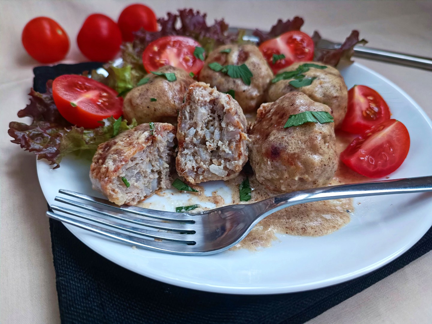 Приготовила тефтели в сливочном соусе на сковороде. Фарш использовала свиной. Для соуса взяла 10% сливки, вместо бульона также использовала воду. Фарш смешала с отварным рисом, измельчённым луком, добавила яйцо, соль, перец. Сформировала тефтели, обваляла их в муке и обжарила на растительном масле. Тефтели положила в приготовленный соус, протушила 20 минут. Сочные, мягкие , аппетитные тефтели в нежном сливочном соусе можно подавать с любым гарниром- вкусный, сытный ужин обеспечен! Спасибо за рецепт, katushafin!