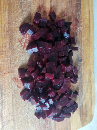 Как сварить свеклу? Можете просто отварить ее в кастрюле в воде. Для этого хорошо помойте корнеплоды с щеткой, залейте их холодной водой и поставьте на средний огонь. После закипания огонь убавьте и варите свеклу от 30 до 60 минут, в зависимости от размера плодов. Также свеклу можно запечь в фольге в духовке при t 180°С в течение 30-40 минут. Или в микроволновке при максимальной мощности 6-8 минут. Охлажденную и очищенную свеклу нарежьте крупными кубиками.