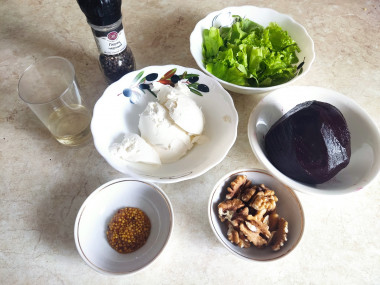 На блюдо выложила листья салата, свеклу, кусочки сыра, орешки. Для заправки смешала горчицу, лимонный сок, масло растительное.