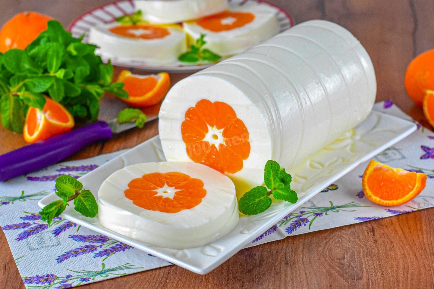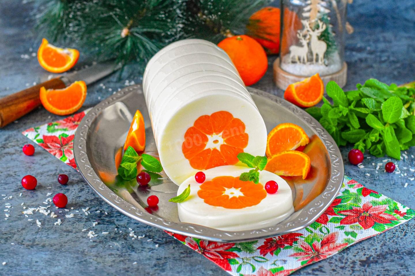 Выньте застывший мандариновый десерт, разрезав бутылку сбоку. Уберите шпажку. Новогодний десерт с желатином и мандаринами нарежьте ломтиками и подайте к столу, украсив мятой. Приятного аппетита!