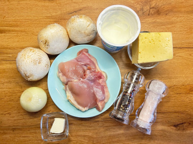 Как сделать жульен с грибами, курицей, сметаной, сыром? Подготовьте продукты. Кроме окорочков вы можете взять любые части курицы, на кости или без, у меня филе бедрышек. Сметана подойдет любой жирности. Вместо нее можно использовать сливки.