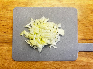 Разогрейте на среднем огне сковороду. Налейте на нее растительное масло для жарки и выложите кусочек сливочного. Сливочное придаст продуктам приятный вкус, а растительное не даст ему сгореть, так как у него более высокая температура горения. Выложите в масло нарезанный лук. Обжарьте его несколько минут до прозрачности.