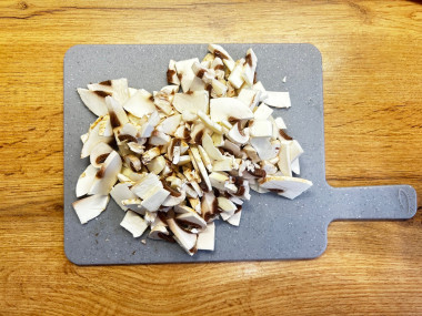 Шампиньоны аккуратно промойте от загрязнений. Не мочите их слишком сильно — напитавшись влагой, грибы становятся водянистыми и не вкусными. Чистые шампиньоны обсушите бумажными полотенцами. Нарежьте их на небольшие кусочки.