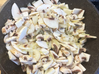Выложите к луку грибы, перемешайте. Посолите и поперчите их. Грибы от соли выделят много жидкости. Обжаривайте их, помешивая, до ее испарения, около 10 минут.