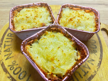 Дождитесь расплавления сыра, на это уйдет 10-15 минут. Затем выньте формочки с жульеном из духовки.