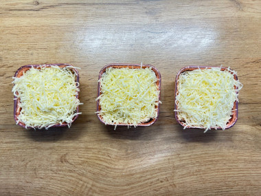 Возьмите подходящую посуду для запекания жульена. Выложите в нее получившуюся массу. Посыпьте сверху жульен натертым сыром. Поставьте его в духовку, предварительно разогретую до 180°С.