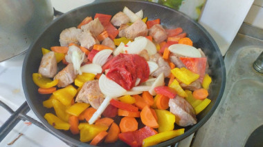 Нарежьте полукольцами лук, а морковь полукружьями, добавьте к мясу, перемешайте и жарьте на среднем огне до мягкости овощей примерно 3-5 минут.