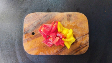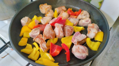 На отдельной сковороде обжарьте нарезанный кубиками перец до мягкости, после чего отправьте его к мясу.