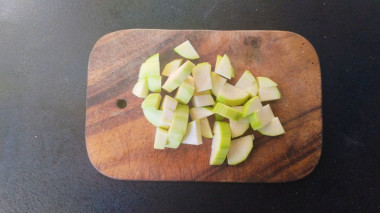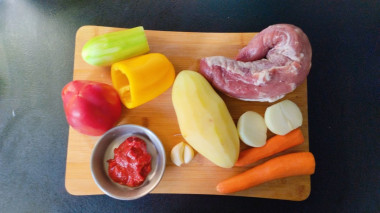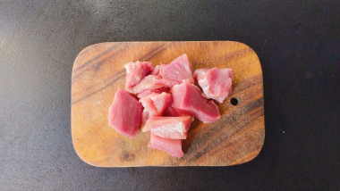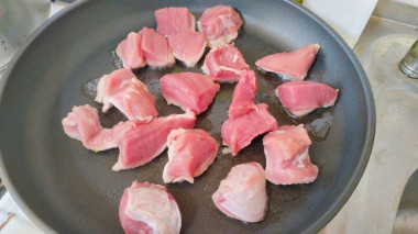 Как сделать мясной гуляш? Подготовьте ингредиенты. Нарежьте мясо на небольшие кусочки. Посолите. Картофель нарежьте кубиками такого же размера, как свинину. На сковороде разогрейте растительное масло. Выложите в сковороду кусочки мяса и обжарьте на сильном огне, помешивая, до румяной корочки минут 5-7. Благодаря обжариванию сок внутри мяса "запечатается", и оно останется сочным. О том, как подобрать сковороду и растительное масло в конце рецепта.