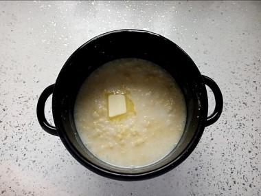 Затем добавьте в кастрюлю изюм и сливочное масло. Проварите кашу еще минут 5 и снимите с огня. Оставьте кашу постоять под крышкой еще минут 10, чтобы она пропарилась. Кстати, изюм и масло можно добавить позже, непосредственно сразу в тарелки перед подачей.