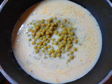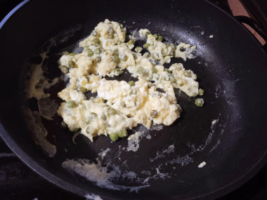 Горошек промойте и обсушите. Если используете замороженный горошек, предварительно разморозьте его и слейте выделившуюся при этом жидкость. Если используете консервированный горошек - нужно вынуть его из рассола и обсушить, но предварительно не обжаривать (пропустить шаг 5) и добавить в сковороду после яиц (шаг 6).