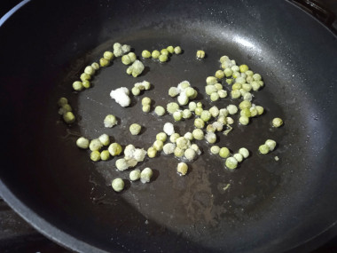 В сковороде на маленьком огне разогрейте растительное масло. Выложите горошек и обжарьте, помешивая, 2-3 минуты.