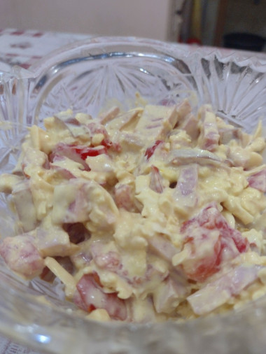 Попробовала рецепт салата из помидор. Все делала по раскладке, кроме майонеза. Майонез сделала домашний: 2 желтка куриных яиц растереть с 0,5 ч.л. соли, 2 ч.л. горчицы, 2 ст.л. не густой сметаны. Салат очень сытный. Основной вкус как у " Еврейской закуски ". Ставлю отлично : хотела бы видеть такой салат на новогоднем столе.