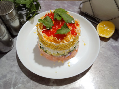 Приготовила салат с красной рыбой огурцом и сыром по этому рецепту. Выбрала для салата мраморный сыр, домашние яйца, свежий огурец и слабосоленую семгу. От себя ещё добавила мелко порезанный фиолетовый лук. Семгу мелко порезала, огурец тоже. Сваренные вкрутую яйца разделила на белки и желтки. Натерла желтки, сыр и белки на средней тёрке в отдельные тарелки. Готовила салат порционно. Одну порцию делала в кольце из пластиковой бутылки, вторую порцию собирала в судочке на работу) Укладывала все измельчённые ингредиенты слоями по описанию в рецепте и смазывала тонким слоем майонеза. Лук уложила на красную рыбу, а верхний слой сделала из тёртого сыра. Украсила красной икрой, оставалась чайная ложечка) Это потрясающе красивый и очень вкусный салат. Огурчик приятно похрустывает вместе с лучком. Сёмга идеально сочетается со всеми продуктами. Белки и желтки придали воздушности и нежности салату. Сыр прекрасно дополняет всю эту историю. В общем сложно оторваться от этого безумия вкусов. Шикарный салат! Огромное спасибо автору!