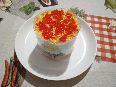 Перед подачей снимите сервировочное кольцо и украсьте салат по желанию. Подавайте салат к столу. Приятного аппетита!