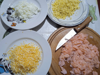 Сыр для салата можно взять любой: твердый, полутвердый, плавленый или мягкий. Главное, чтобы он был вкусным, качественным, без заменителей молочных жиров. Натрите сыр на крупной терке. Мягкий или плавленый сыр по желанию можно нарезать мелкими кубиками.