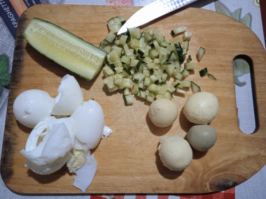 Огурец помойте, обсушите. Кожицу с огурца по желанию можно срезать. Нарежьте огурец мелкими кубиками.