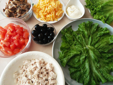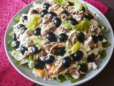 Приготовила салат майский с грибами, курицей и помидорами. Накануне отварила куриную грудку, обжарила шампиньоны. Поэтому сегодня на приготовление салата ушло совсем немного времени. На блюдо уложила листья салата, на них слоями выкладывала нарезанные помидоры, сыр, курицу, жареные шампиньоны, маслины, добавляя дополнительно измельчённые листья салата( я просто рвала их руками не слишком мелко). Кстати, и первый слой лучше делать не из целых салатных листьев, а также немного их измельчить, так будет удобнее брать салат с блюда. На каждый слой я с помощью кондитерского мешка наносила тонкую сеточку из майонеза. Салат получился вкуснейший!!! Очень сочный, яркий. Сегодня я готовила салат к семейному ужину, обязательно приготовлю и на праздничный стол , уверена, что гости оценят его по достоинству. Рекомендую всем! Спасибо за рецепт, Ellisa!