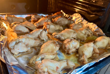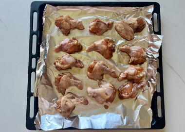 Застелите противень кулинарной бумагой. Фольгу лучше не использовать, так как при запекании она прилипает к крылышкам и её потом трудно отделить. По всей поверхности противня разложите куриные крылышки и поставьте противень в разогретую до 180 градусов духовку на 30-40 минут. Точное время зависит от вашей духовки.