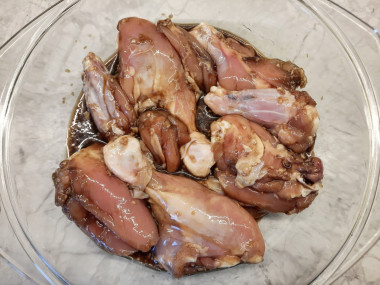 Куриные крылышки положите в чашу с соусом и хорошо всё перемешайте, чтобы соус равномерно покрыл всю поверхность крылышек со всех сторон. Накройте чашу крышкой или пищевой пленкой и оставьте примерно на час при комнатной температуре. За это время куриное мясо пропитается соусом. Заранее включите духовку на 180 градусов.