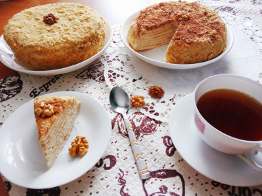 Когда нижняя сторона коржа подрумянится, переверните его на другую сторону и выпекайте до готовности. Пока выпекается один корж, раскатайте следующий. Приготовьте таким образом все коржи. Обрезки теста соедините, из них можно раскатать еще 1-2 коржа. Готовые коржи остудите.