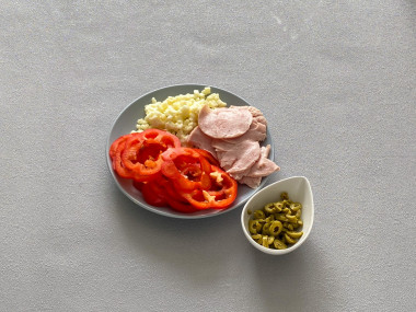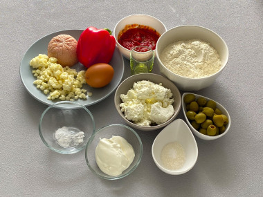 Как испечь творожную пиццу на творожном тесте в духовке? Подготовьте все необходимые продукты. Для начинки можете брать любые колбасные изделия - ветчину, салями и т.д. Вместо томатного соуса можно взять свежие помидоры и измельчить их в блендере. Сыр выбирайте любой, главное чтобы он хорошо плавился.