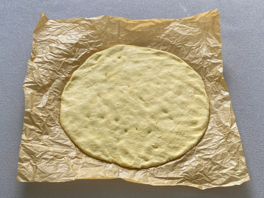 Отдохнувшее тесто раскатайте в круг, выложите в подходящую форму или на противень, смазанный маслом или застеленный пергаментом.