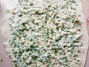 Смешайте плавленый сыр с зеленью рубленой. Плавленный сыр можно брать как классический, без добавок, так и с каким-нибудь вкусом. В этом плане можно смело экспериментировать. Смажьте полученной смесью тонкий лаваш.