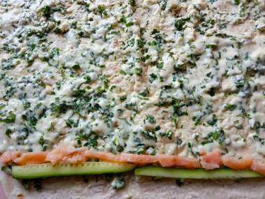 Возьмите край лаваша с начинкой и плотно сверните его от себя на один полный оборот. У вас получится плотный валик. Теперь на оставшуюся часть лаваша, прямо перед свернутым валиком, выложите нарезанный соломкой болгарский перец и несколько кусочков горбуши. Продолжайте закручивать лаваш, захватывая новую порцию начинки. Продолжайте сворачивать лаваш в рулет, чередуя слои из рыбы и огурца и рыбы и перца.