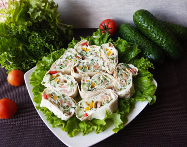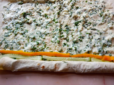 Готовый рулет, завернутый в пленку, хранится в холодильнике до 24 часов. Не рекомендуется замораживать, так как овощи дадут сок и лаваш размокнет.