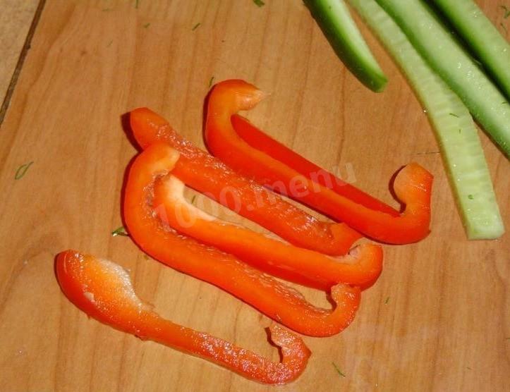 Болгарский сладкий перец вымойте и очистите. У меня красный, но можно взять перец других цветов или использовать разноцветный микс. Нарежьте его соломкой.