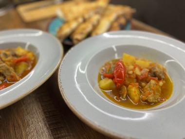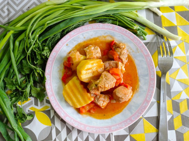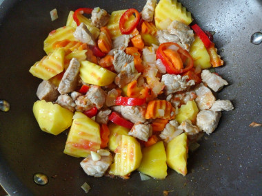 Брала свиную шею,перец сладкий,шампиньоны,лук,морковь ,помидор и картофель. Сначала прижарила мясо,затем добавляю лук и морковь,вместе жарю минут 10. Далее добавляю картофель с остальными овощами,немного воды (примерно треть) ,соль,перец ,любимые приправы и тушу минут 40. Блюдо готово! Можно наслаждаться!) В конце по желанию можно добавить зелень)