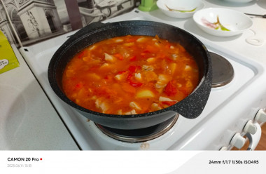 Посолите всё по вкусу, всыпьте аджику и иные любимые специи. Залейте всё водой, около одного стакана будет вполне достаточно (вместо воды можно использовать томатный сок или томатную пасту по вкусу).