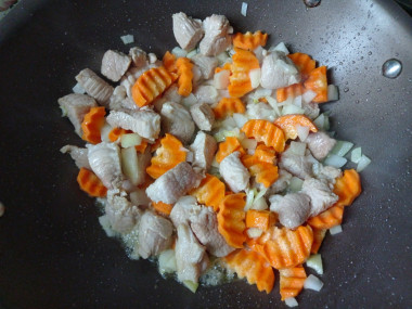 Итак, мясо ополосните под проточной водой и обсушите бумажными салфетками. Нарежьте свинину кусочками небольшого размера. Лук и морковку очистите от кожуры. Лук нашинкуйте крупными кубиками, а морковь кружочками или толстыми брусочками.