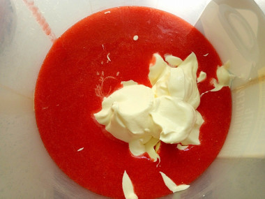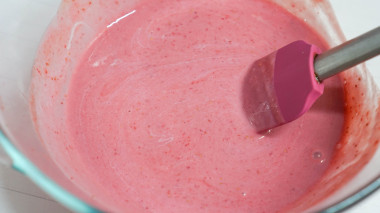 В набухший растопленный желатин добавьте пару ложек сметано-клубничного крема, перемешайте и перелейте в основную массу.