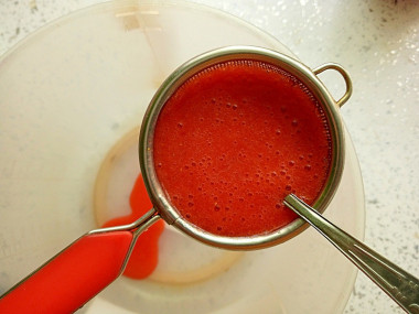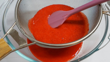Клубнику пробейте погружным блендером в пюре. Протрите через сито, чтобы избавиться от косточек. Пюре я использую в сыром виде. Если хотите продлить срок годности, доведите пюре до кипения и проварите пару минут.