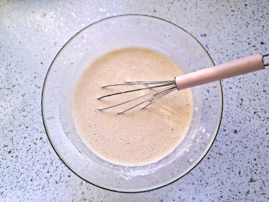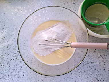 Отмерьте необходимое количество муки в другую миску, смешайте ее с разрыхлителем. Начните порциями вливать в муку жидкую смесь, активно размешивая тесто венчиком — именно таким способом вы сможете избежать комочков. О нюансах работы с разрыхлителем читайте в конце рецепта.