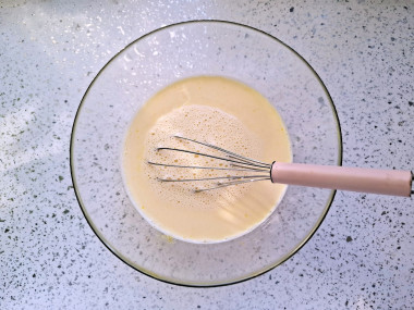 Яйца вбейте в миску, всыпьте в них сахар и соль. Взбейте яйца венчиком до объединения белка и желтка. Миксером пользоваться не обязательно. Влейте в яйца теплое молоко. Лучше подогреть его до приятно-теплой температуры, тогда мука в тесте размешается быстрее. Сливочное масло растопите и влейте в жидкие продукты, перемешайте. О том, как топить масло, читайте в конце рецепта.