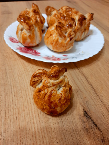 Опять ВИВАТ слоёному тесту ! И в яблочко можно добавить всё, что на ум придёт : и половинку грецкого ореха, и изюминки светлую и чёрную, и даже чайную ложечку варёной сгущёнки, а я как всегда - ложечку мёда...Ничем не испортишь !!!