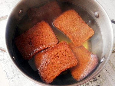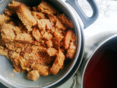 Размоченные сухари верните в первую кастрюлю снова залейте 1 л горячей кипяченой воды. Также оставьте на 1,5 часа. Так весь вкус и аромат из сухарей уйдет в воду.