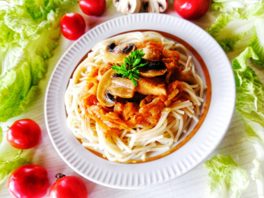 Мясо вышло очень сочное и нежное, грибочки получились упругие и аппетитные. Подливка хорошо сдобрила спагетти, приготовленные на гарнир. Ели их с удовольствием!