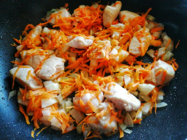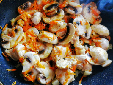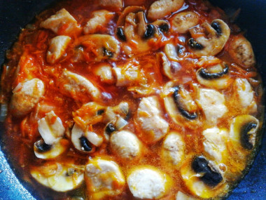 Для готовки взяла куриную грудку, обжарила ее с луком, морковью и шампиньонами. Далее тушила всё под крышкой с томатной пастой и водой. Не добавляла только сметану и чеснок.