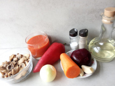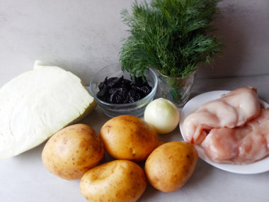 Как сварить борщ с черносливом и грибами? Подготовьте все необходимые ингредиенты по списку. Вместо курицы можно взять любое мясо (свинину. говядину), или по желанию варить без мяса, взяв мясной или овощной бульон или просто на воде. Если нужен наваристый бульон, берите мясо с костью. У меня куриное филе.