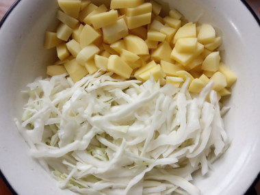 Добавьте в кастрюлю картошку и капусту. Варите еще 15 минут.