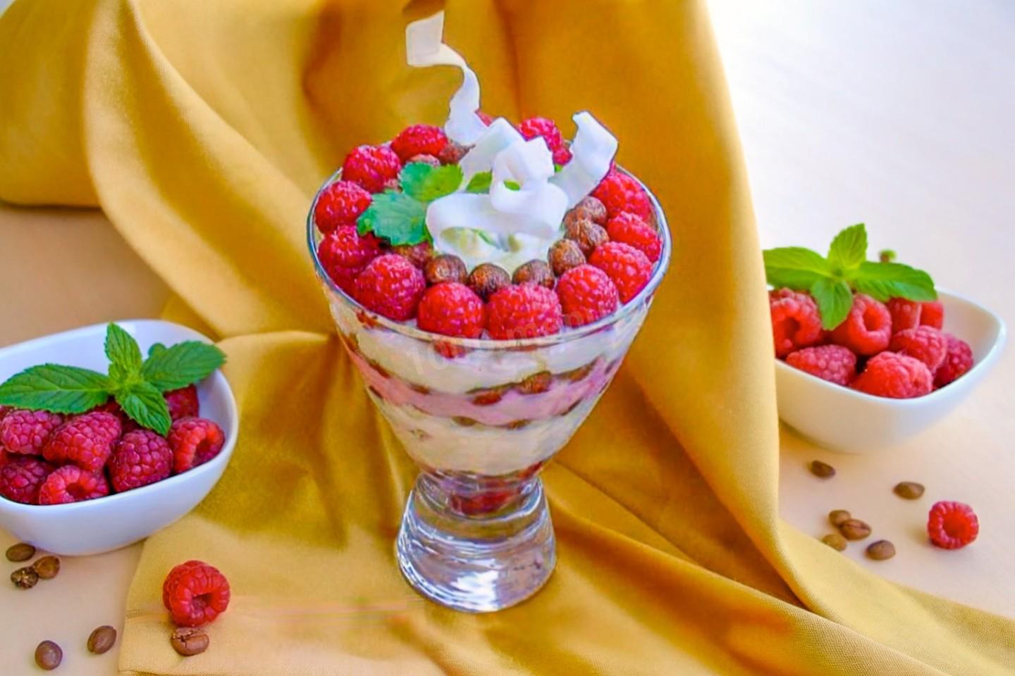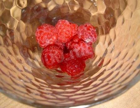 Из дальнейших шагов мы узнаем, как сделать десерт с малиной Приступаем к его сборке. Кладем на дно высокого бокала малину.
