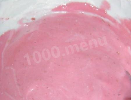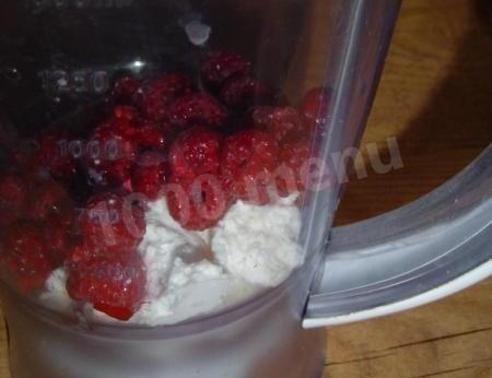 Одну треть массы отделяем и перекладываем ее в блендер, всыпаем малину.