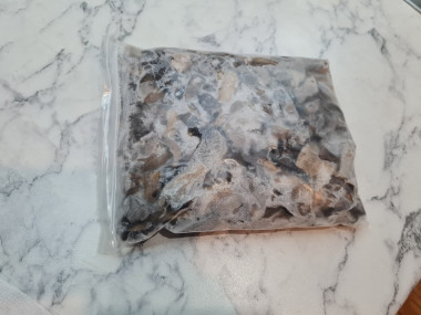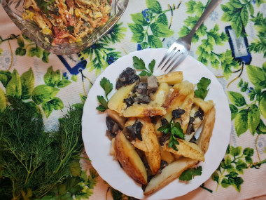 Сегодня на ужин решила приготовить жареную картошечку с сушеными грибами. Ингредиенты максимально простые, а блюдо максимально вкусное. Решить то решила, но времени возиться с сушеными грибами не было, а слюнки от фото уже пошли, поэтому быстренько разморозила смесь варёных грибов из подберезовиков и подосиновиков, заготовленных на зиму. Грибов взяла 300 г. Пока жарила картошку, грибы разморозились в микроволновке, а я начистила лучок и чеснок. На все про все ушло полчаса. И вуяля- ужин на столе! Простой и очень вкусный!